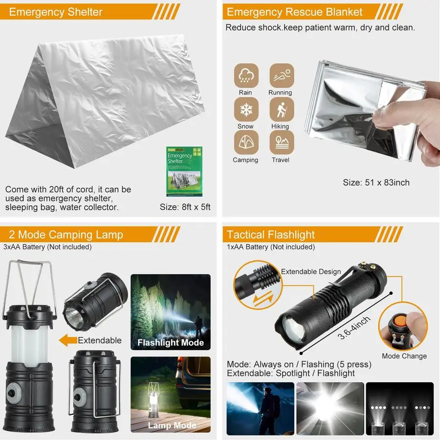Secures the Basics Water, Food, Warmth amp LightEquipped with a collapsible water bag and fishing tools for sourcing essentials. The fire starter, flashlight, camping lamp, and glow sticks ensure up to 72 hours of light, warmth, and signaling capability.