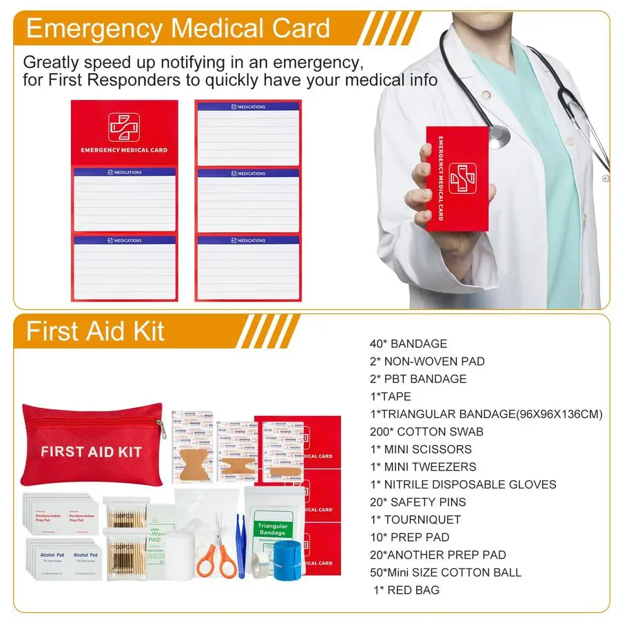 Expanded Professional First Aid Kit Includes a highly visible red first aid pouch stocked with critical medical supplies such as a tourniquet, triangular bandage, and nonwoven pads. The added medical information card facilitates prompt assistance from emergency responders if needed.