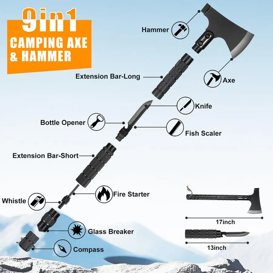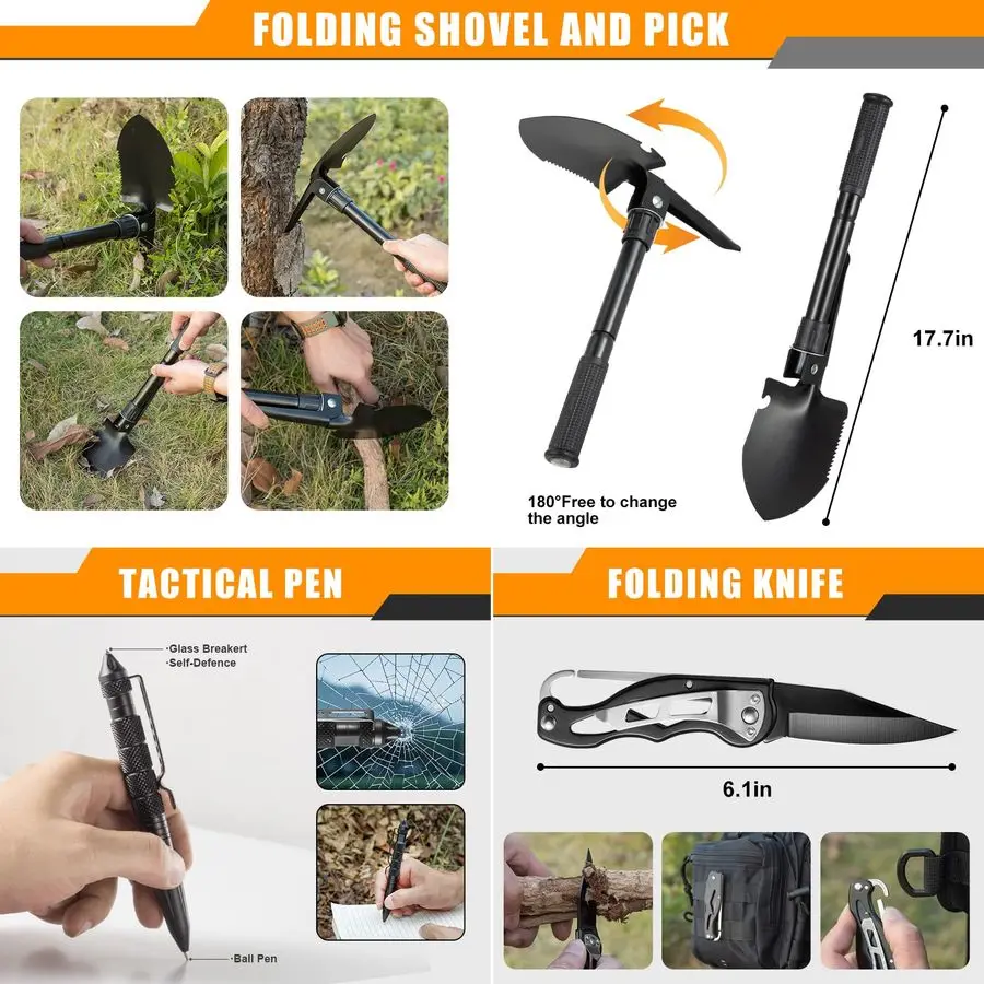 Durable Tools for Shelter amp NavigationFeatures fullsize, 17inch carbon steel tools detachable axe hammer and a multifunction shovel. Combined with the wire saw, emergency tent, thermal blanket, rope, and compass, they enable swift shelter construction and safe navigation.